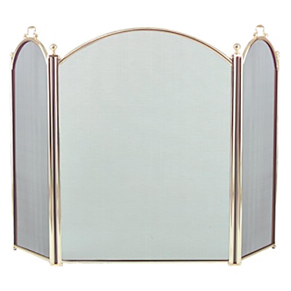 Tri-fold decorative fireplace screen with elegant finials and a plated polished brass finish