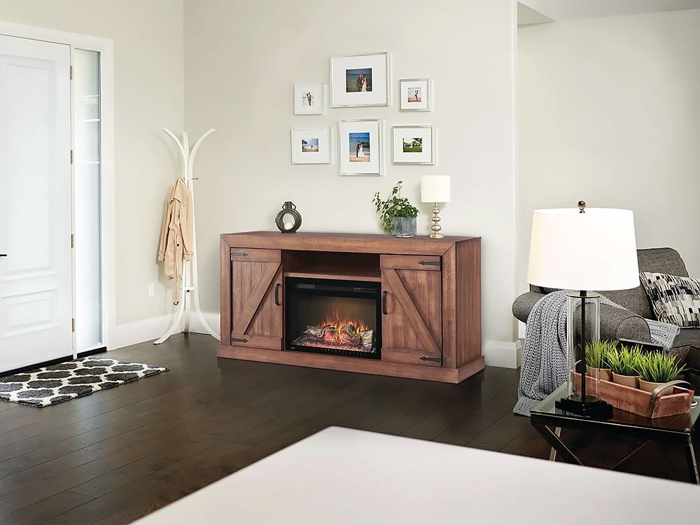 "Lambert Electric Fireplace TV Stand in Rustic Wood"