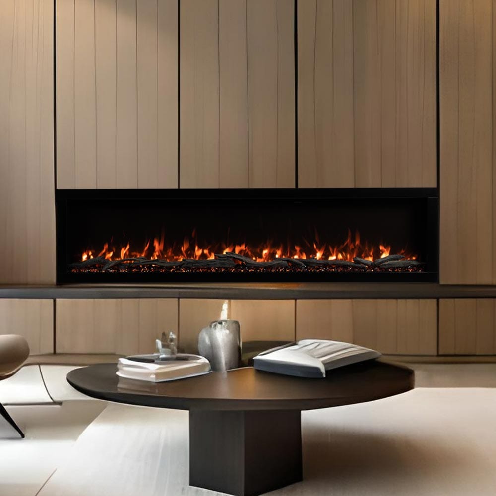 Feature01 Ultra-Wide Viewing Area – Sleek, modern frame maximizes flame visibility.